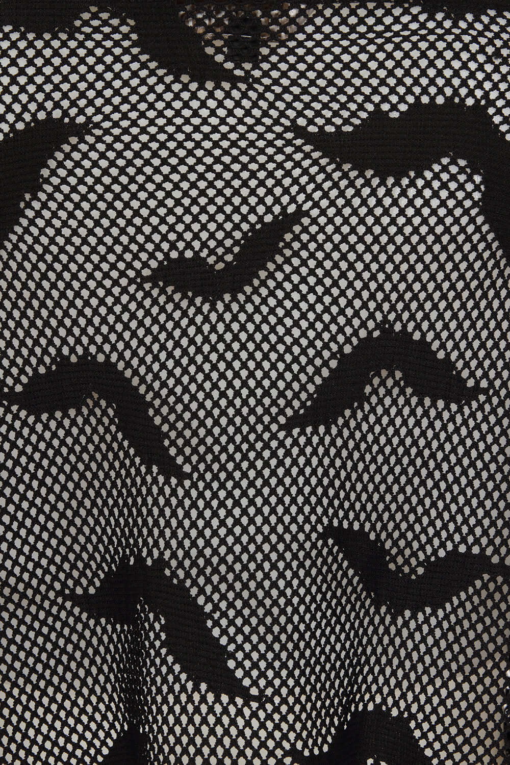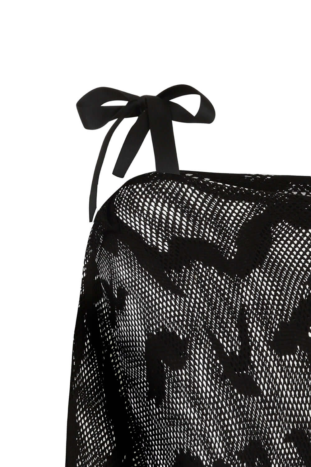 Introducing the Banned Apparel Elvira Top. This black mesh long-sleeve crop top boasts an eye-catching sheer design with an edgy abstract pattern. The boat neckline is adorned with delicate ribbon tie straps for a feminine touch. Made from lightweight and breathable fabric, it's perfect for layering over bralettes or dresses.