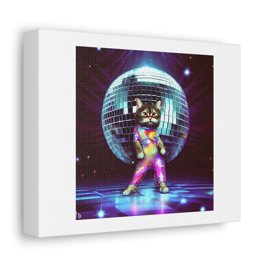 1970s Cat Under a Disco Ball digital art 'Designed by AI' on Satin Canvas