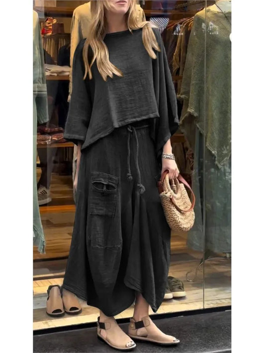 Linen Fashion Bell Sleeve Women's Top and Skirt Two-Piece, Plus Sizes