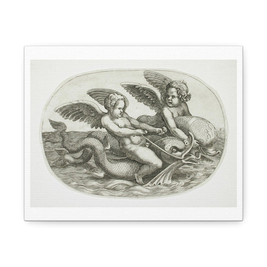 Two Cupids Riding a Dolphin by Adamo Scultori and Giulio Romano (circa 1540), Art Print from the Original on Canvas