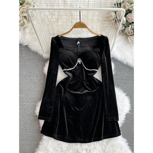 Vireous French-Style Vintage Black Velvet Dress