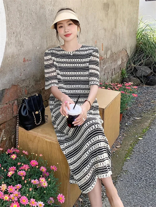 Vireous French-Style Striped Knitted Loose Dress