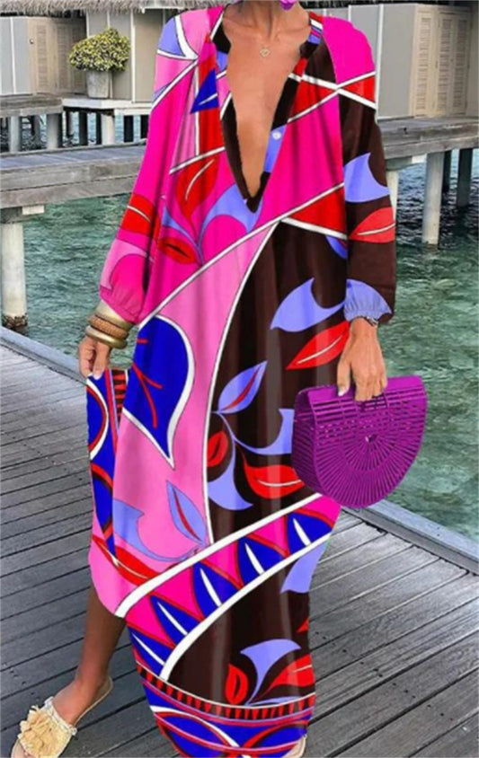 Bold Print Pullover Long Sleeve V-Neck Long Loose Dress, Spring and Summer Collection