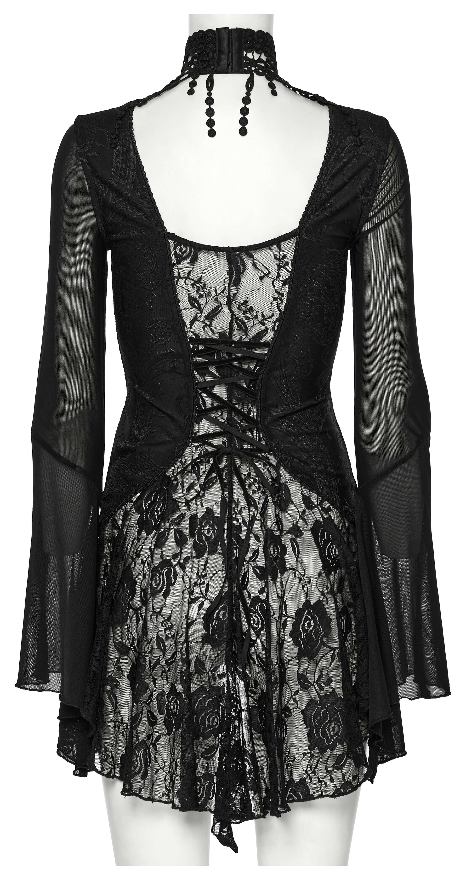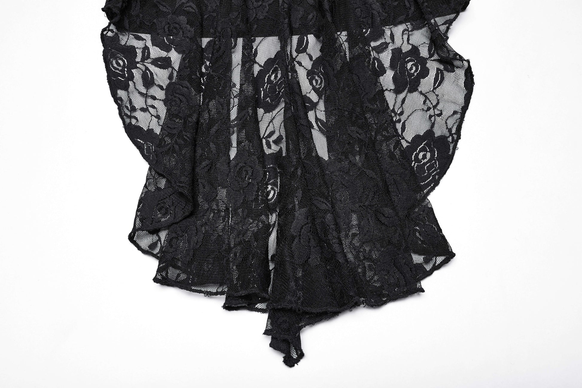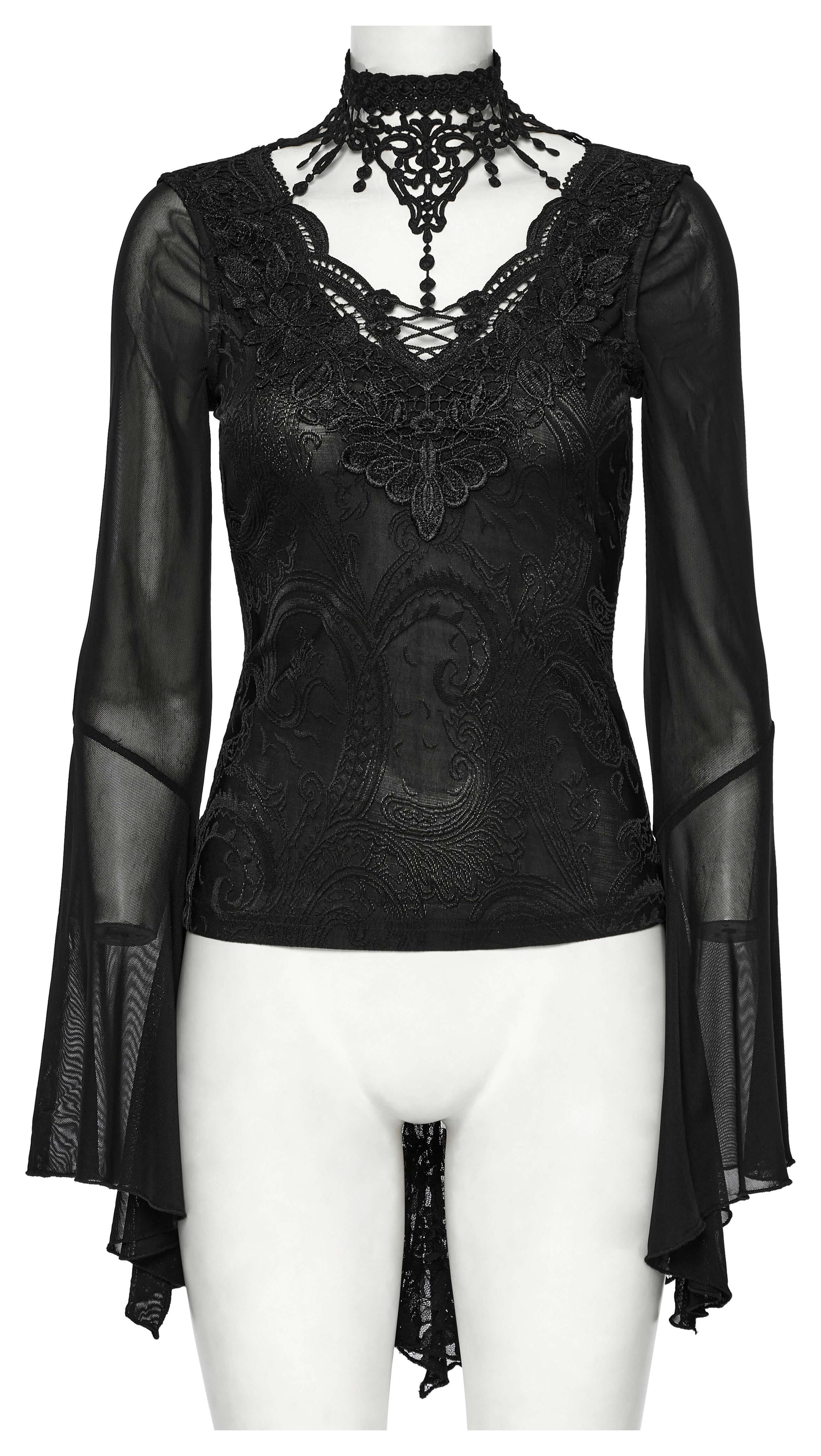 Dare to be different in the Punk Rave Bexley Shirt! This cheeky little number blends elastic flocked knitted fabric with playful lace and mesh elements. The gorgeous lace collar adds a dash of elegance to your rebellious side, while those quirky irregular cuffs and hem keep things delightfully unpredictable. Spin around to reveal the sassy see-through back that's sure to turn heads and start conversations!