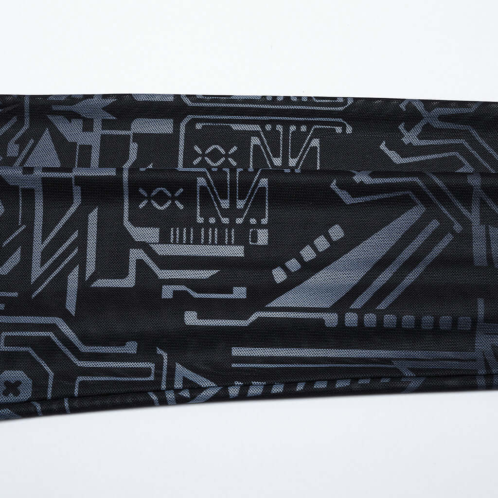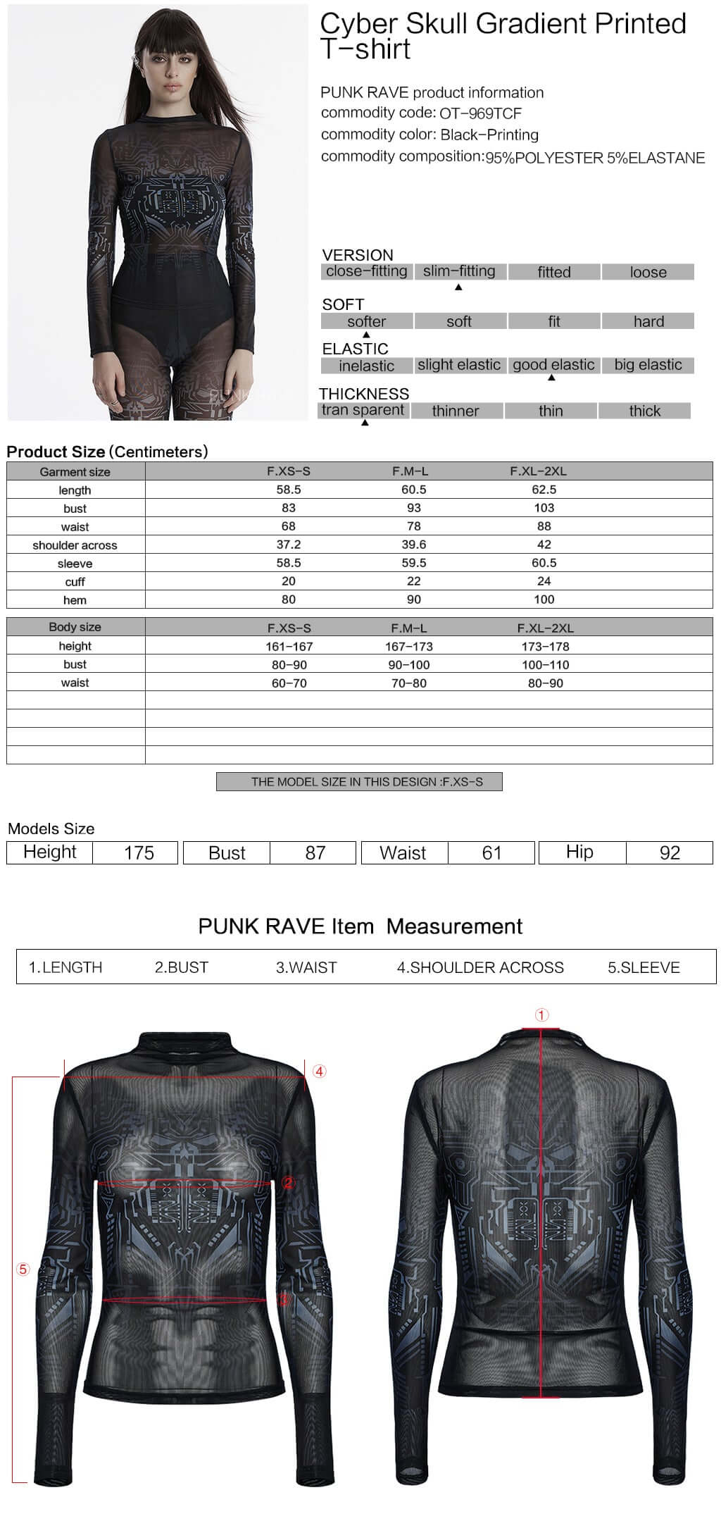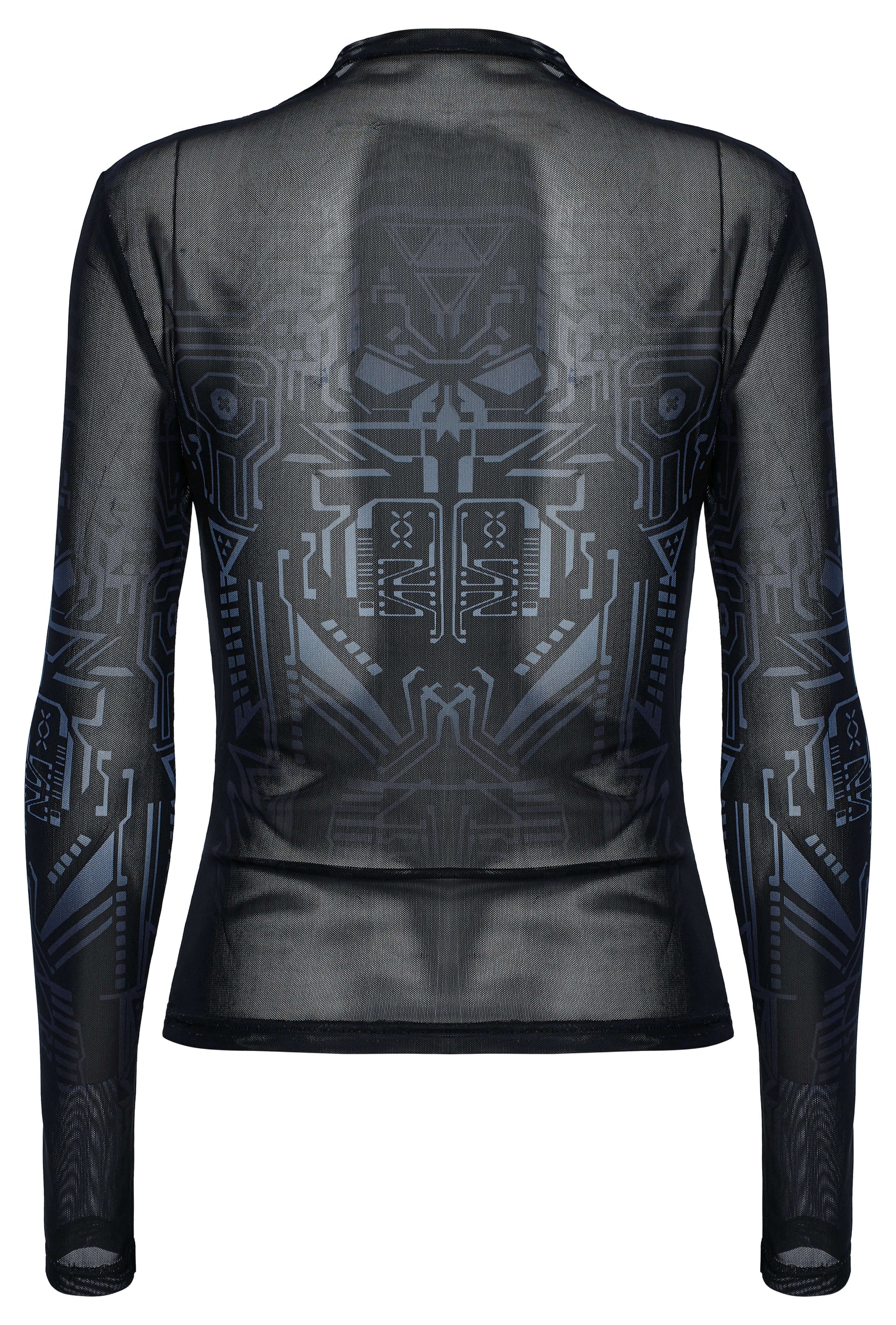 Introducing our Punk Rave Eluana Cybergoth Print Mesh Long Sleeve Top! The unique, futuristic mechanical skull print, combined with gradient printing technology, creates a bold cyberpunk style. Stay edgy and cool with this black top. Get ready to turn heads and stand out from the crowd!