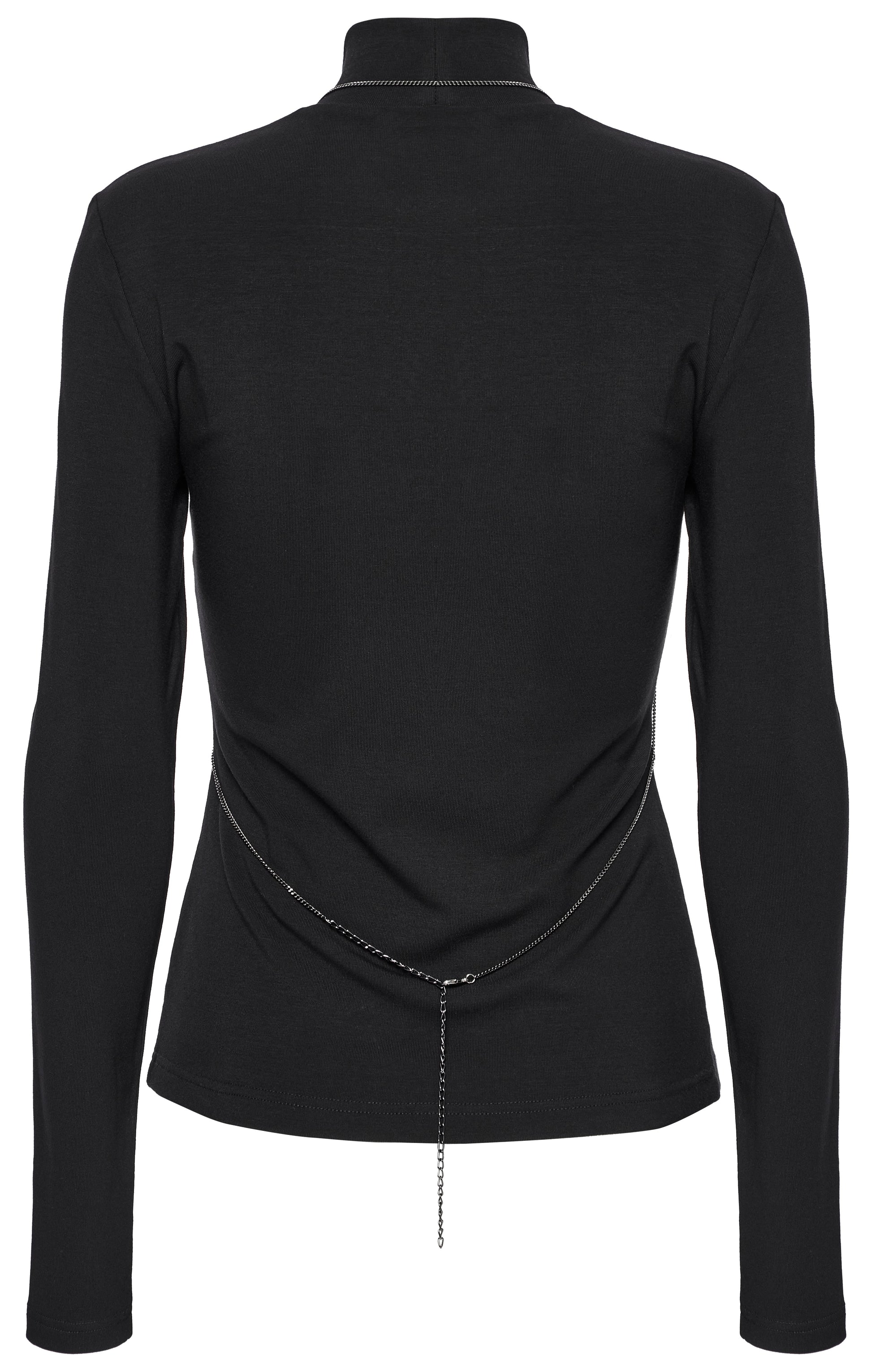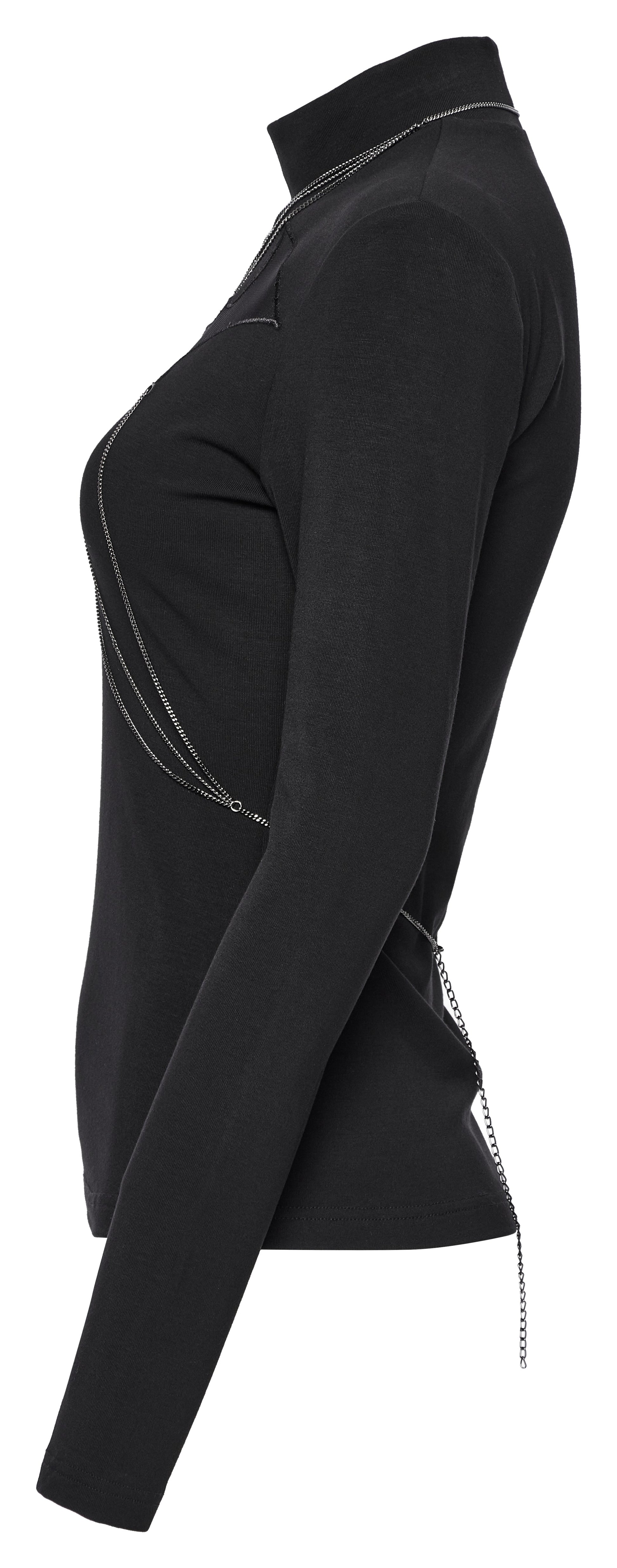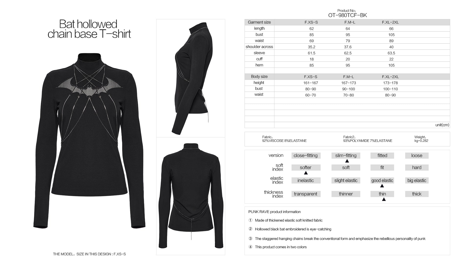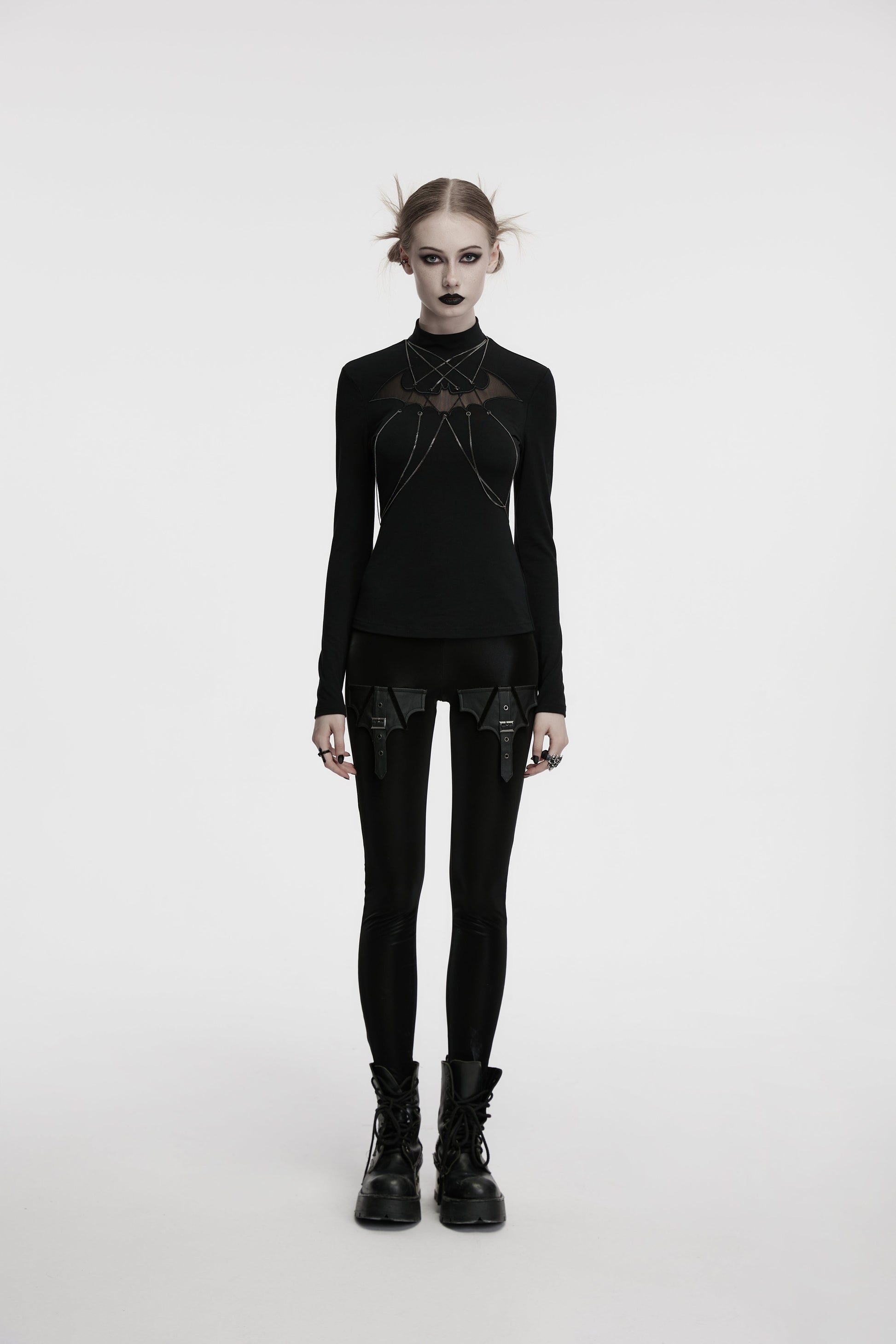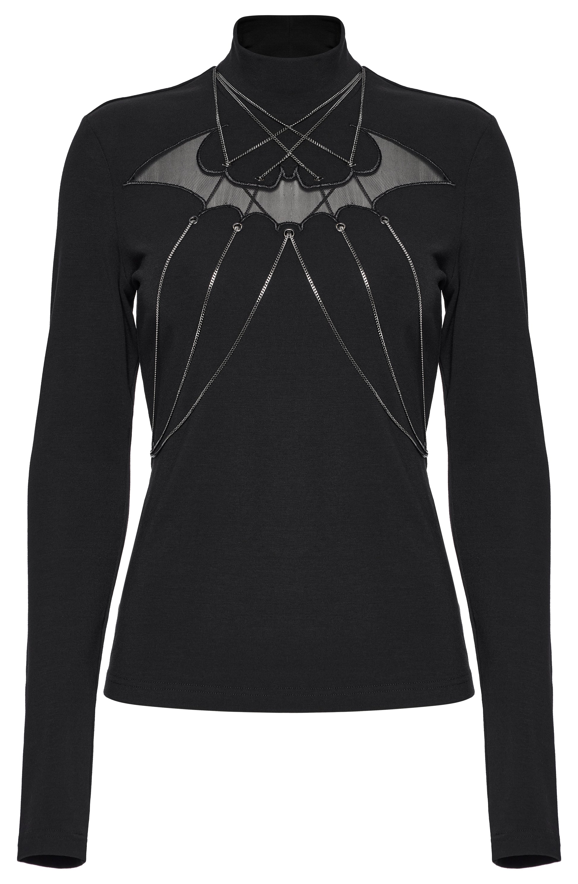 Unleash your dark allure with the Punk Rave Morrigan Bat Chain Goth Top in Black. Crafted from thickened elastic knitted fabric, this striking piece combines comfort with dramatic punk-inspired styling.