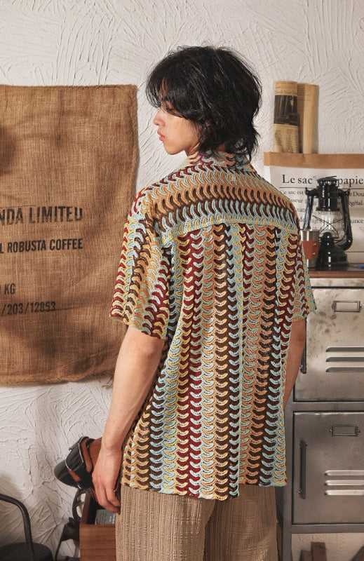 Men's Cuban-Collar National-Style Hollow Out Jacquard Short-Sleeve Shirt