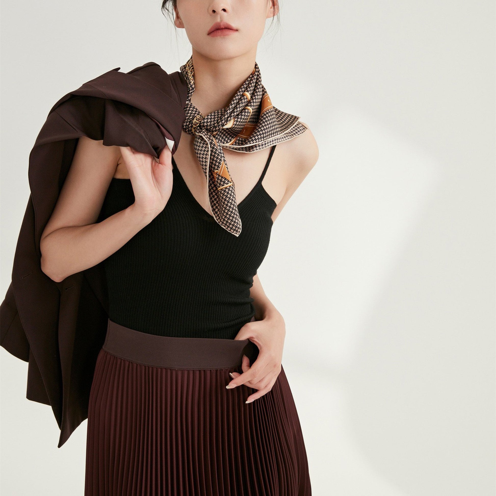 Classic Houndstooth Silk Scarf, Hand-Rolled Square Bandana, Black and Beige