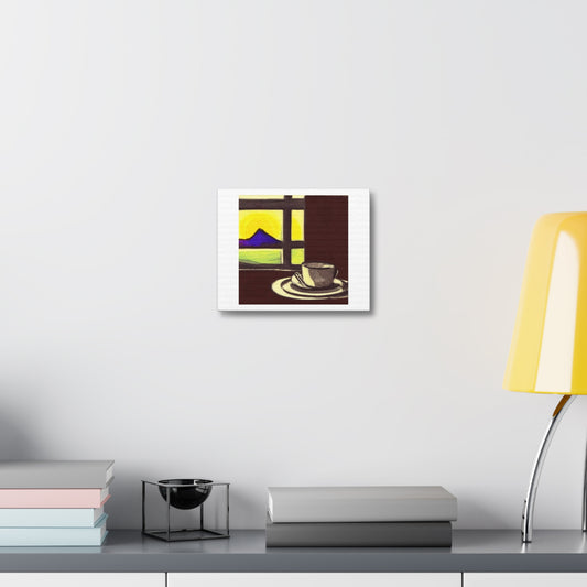 Modernist Sketch of a Coffee Mug On Table Beside a Window Art Print 'Designed by AI' on Satin Canvas