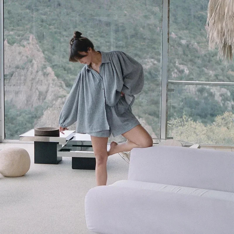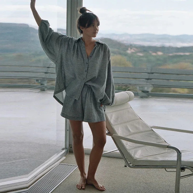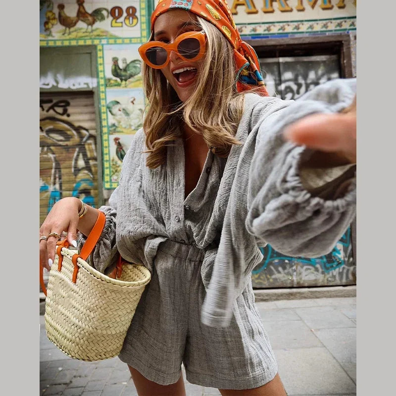 Features: women's button shirt, with elastic waist, wide-leg shorts. Loose, baggy fit. Soft and light feeling. Big folds with feature buttons. Designed with a loose fit and slight stretch, these shorts ensure a comfortable experience throughout the day.