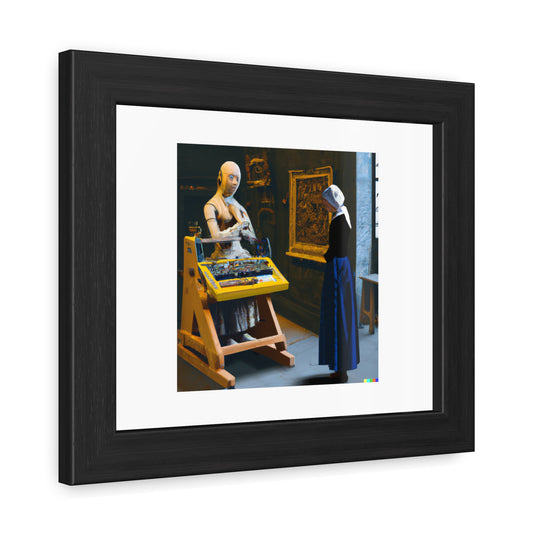 Young Woman Standing At A Virginal With A Robot Machine In The Style Of Johannes Vermeer 'Designed by AI' Wooden Framed Print