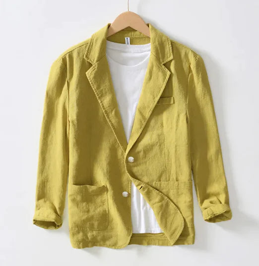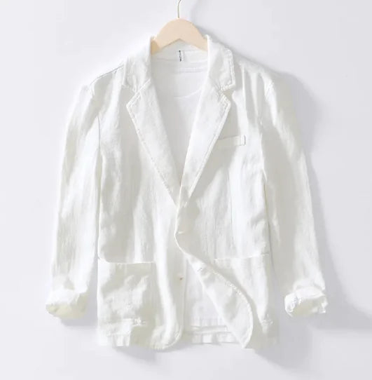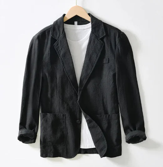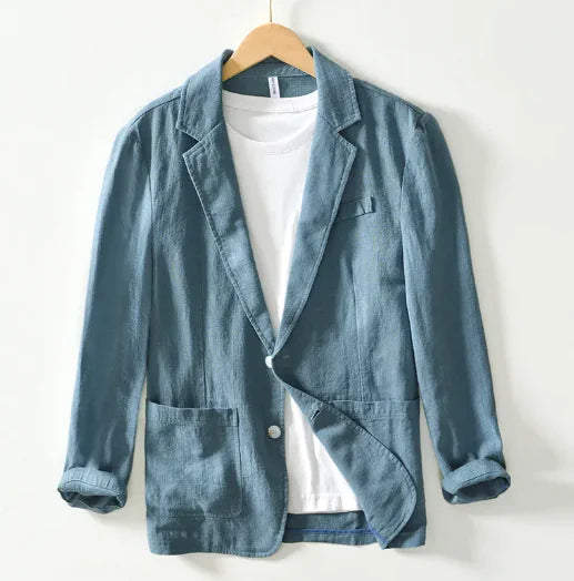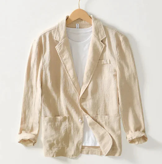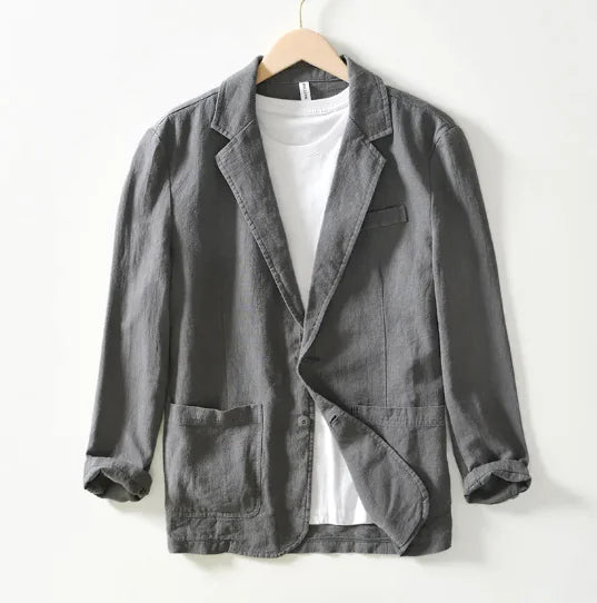 Made from a breathable blend of cotton and linen, this jacket is perfect for warmer weather or casual outings, offering lightweight wear and a relaxed fit. The loose-fitting design ensures maximum comfort, allowing you to move freely, while still maintaining a sharp and polished appearance.
