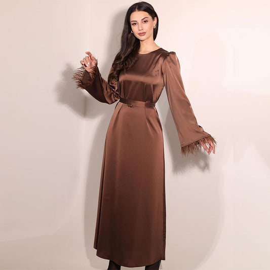 Vireous Round Neck Feather Cuff Elegant Satin Long Dress