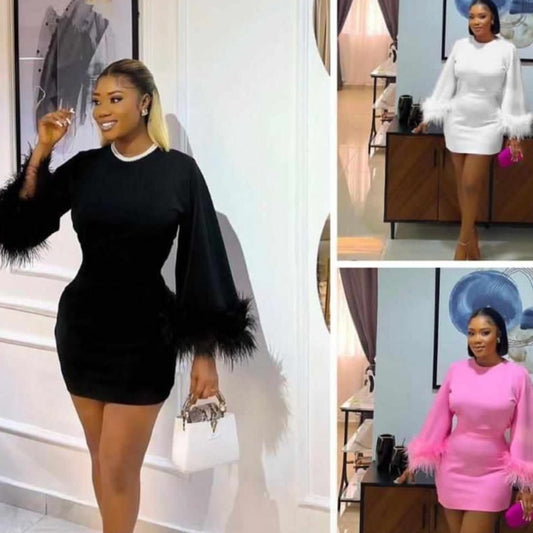 Square Collar Ostrich Feather, Long Sleeve Socialite Dress