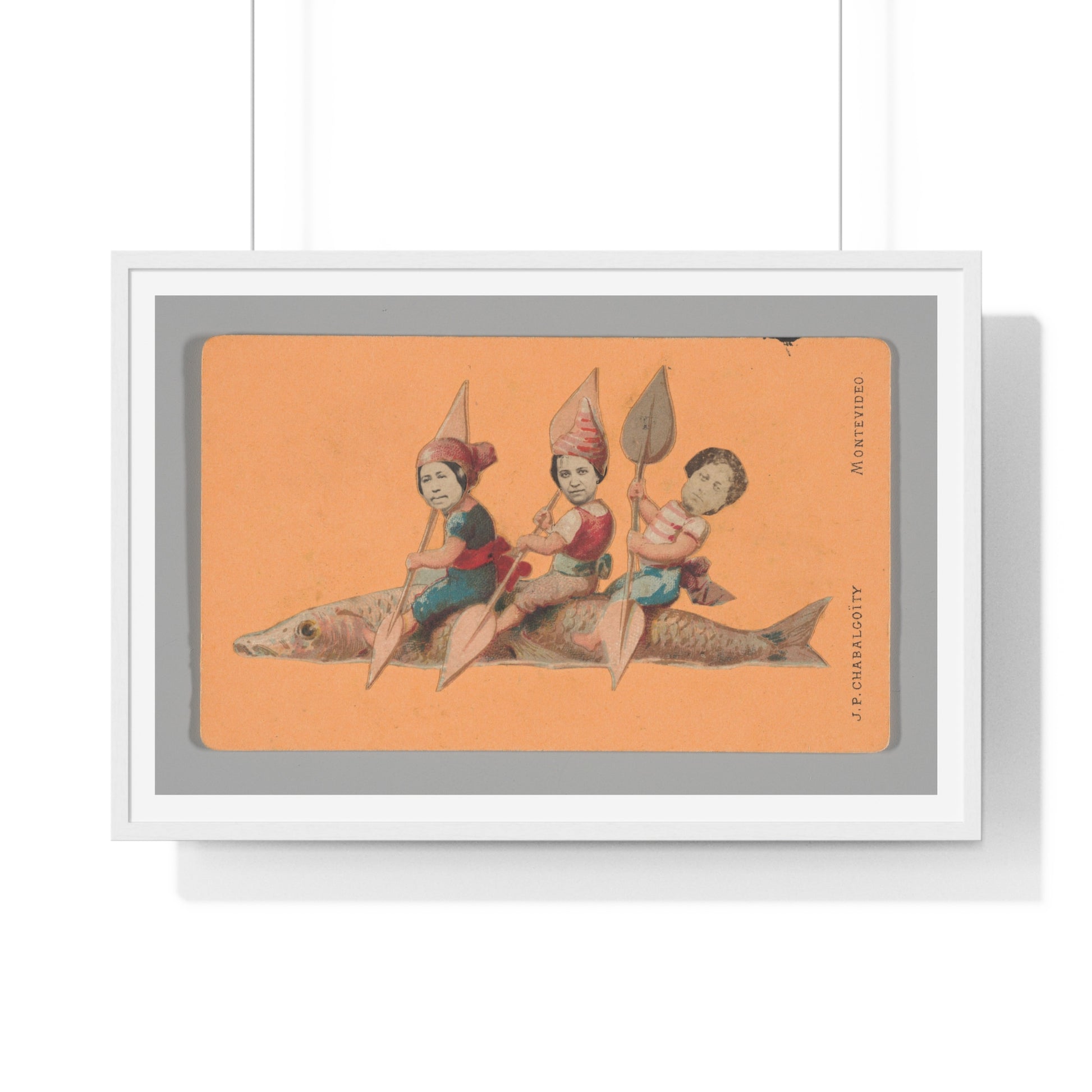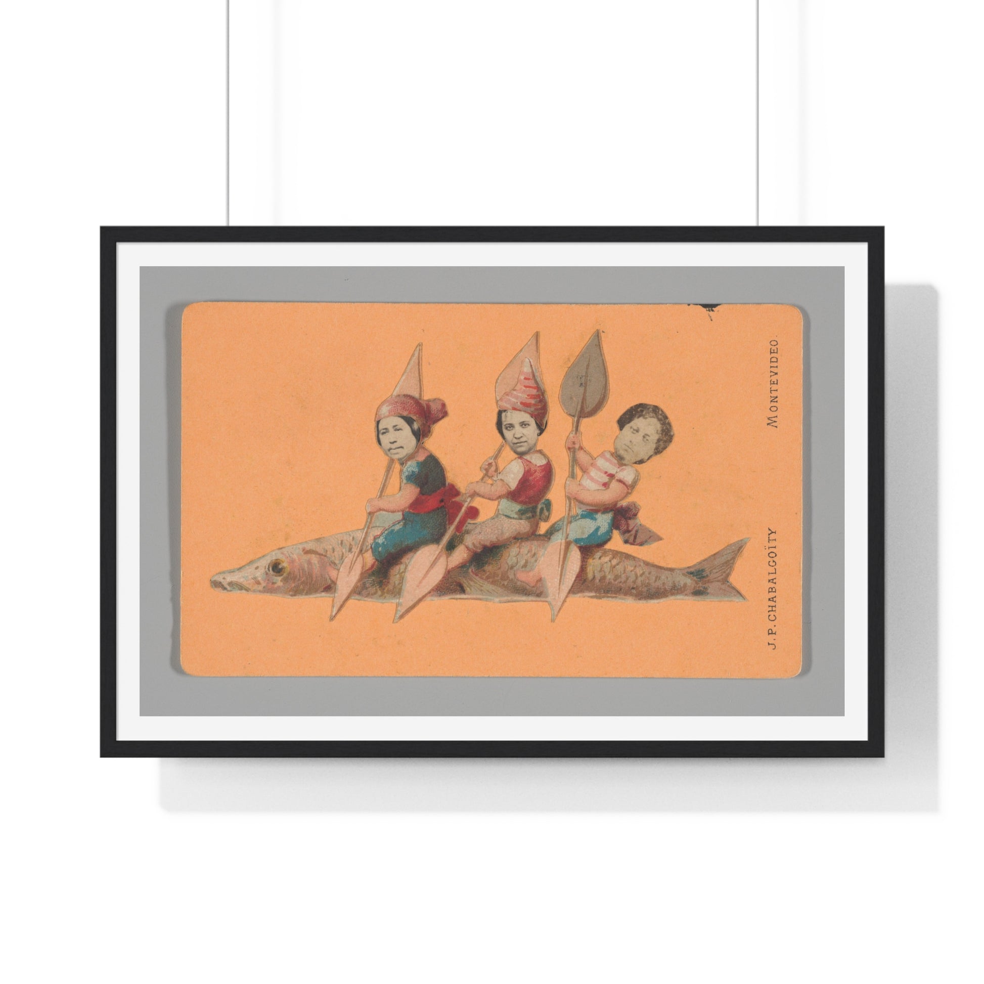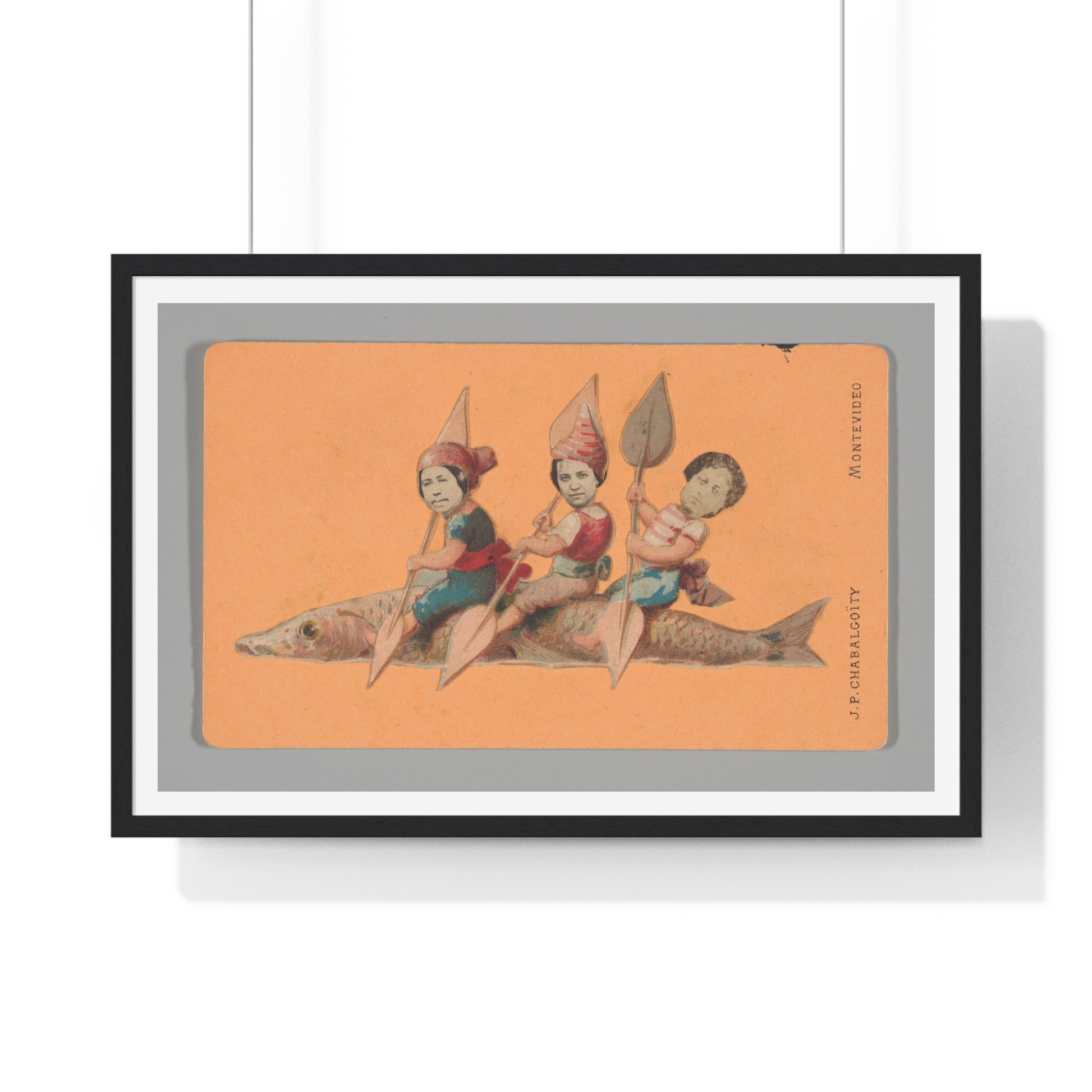 Uruguayan Photo Collage, Three People Holding Oars, Sitting on a Large Fish (circa 1875) Framed Art Print