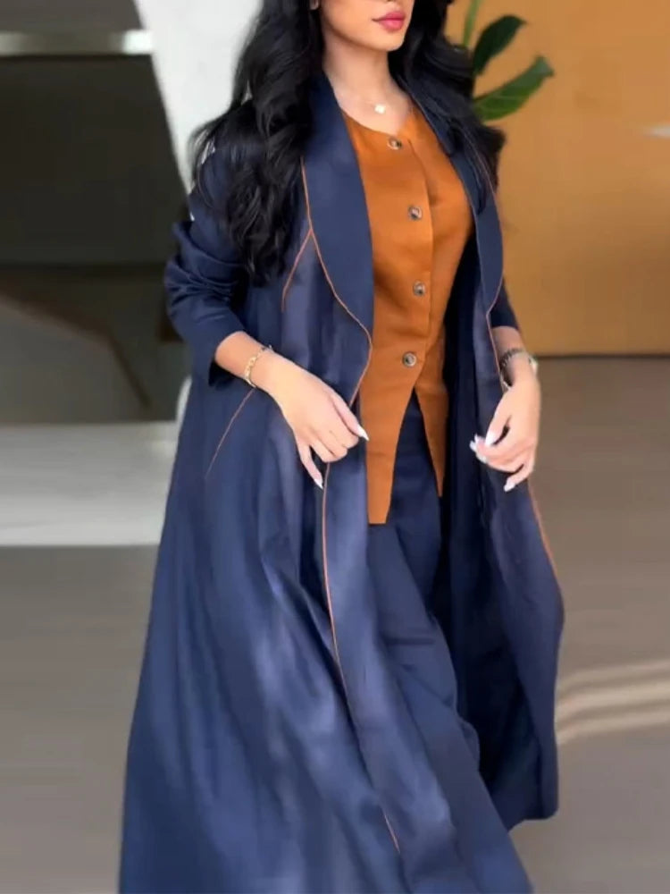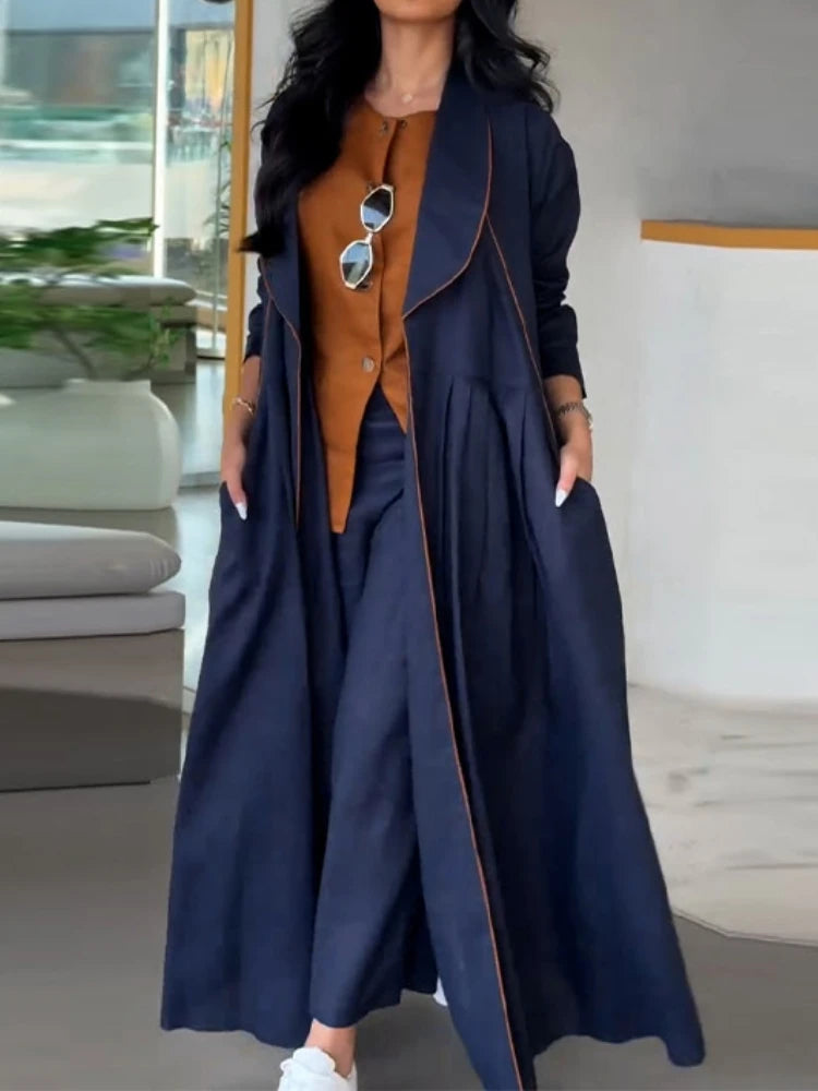 Features: autumn and winter collection, fashion, contrast-trim open front long coat, pockets, pleated