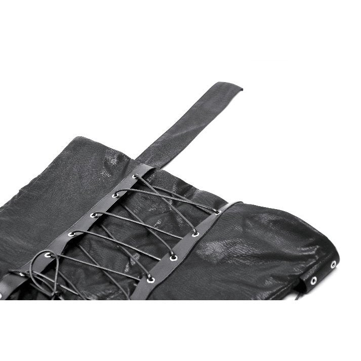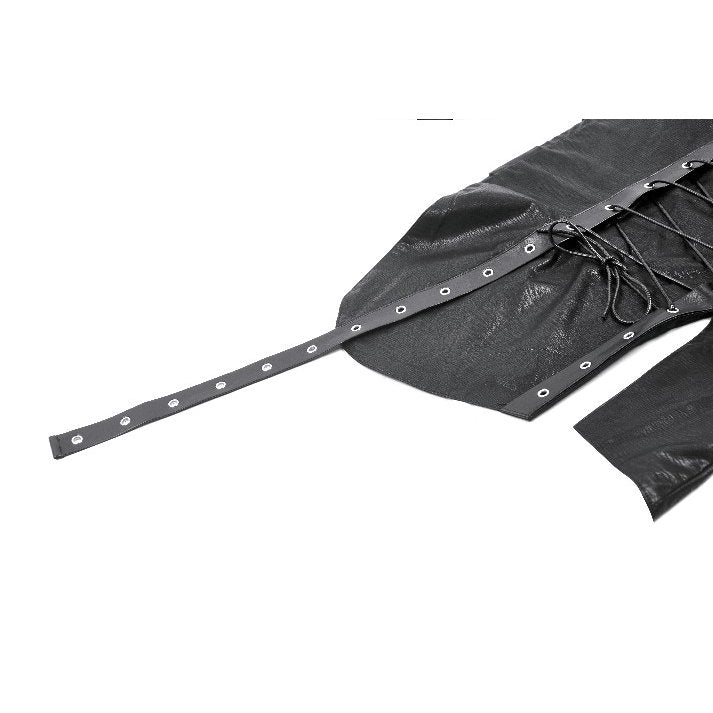 The tailored fit is enhanced with a waist belt and angled hemline, creating a bold, armour-like silhouette perfect for concerts, club nights, and high-impact goth styling. Crafted from soft yet structured faux leather for comfort and durability.