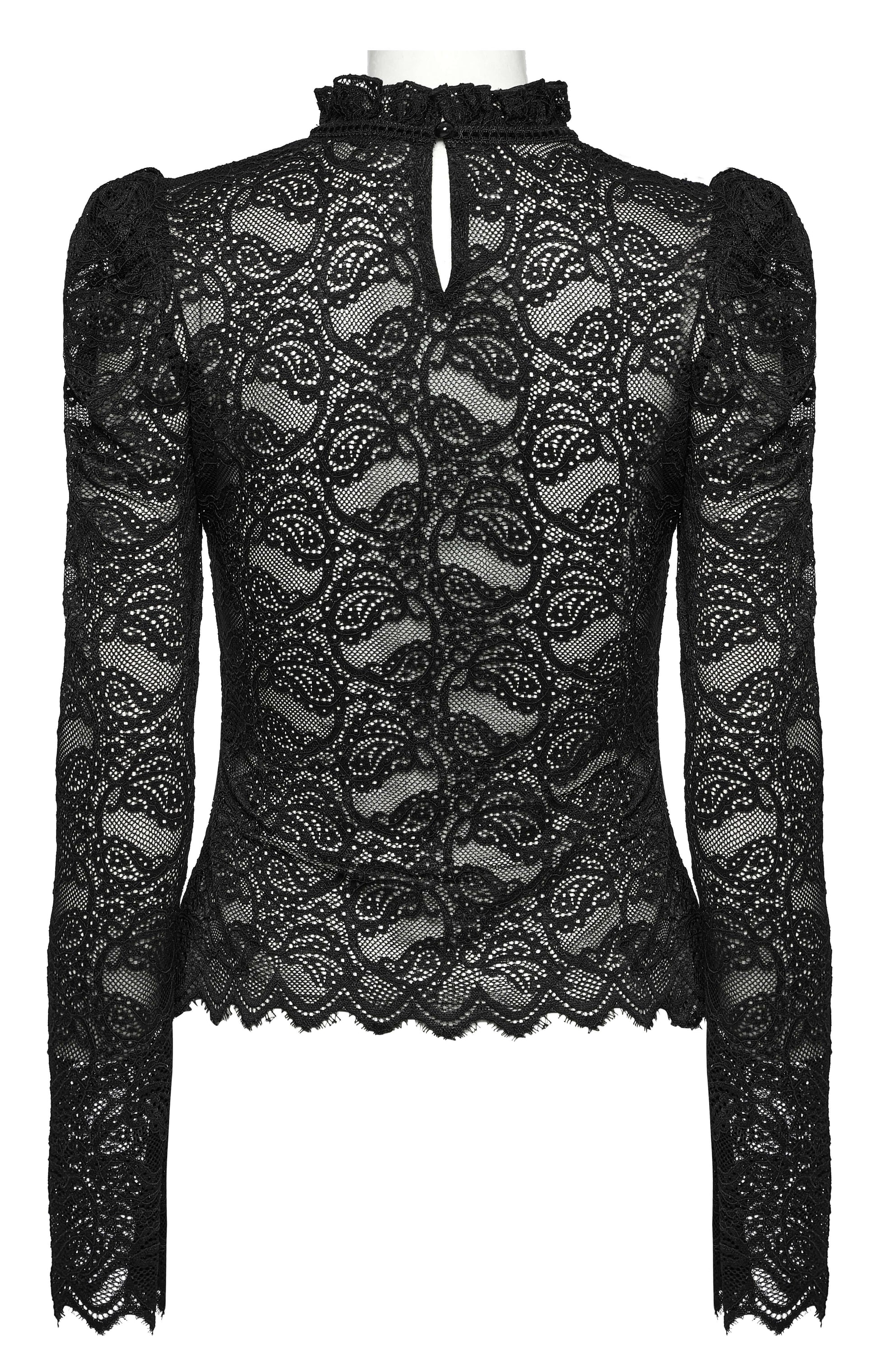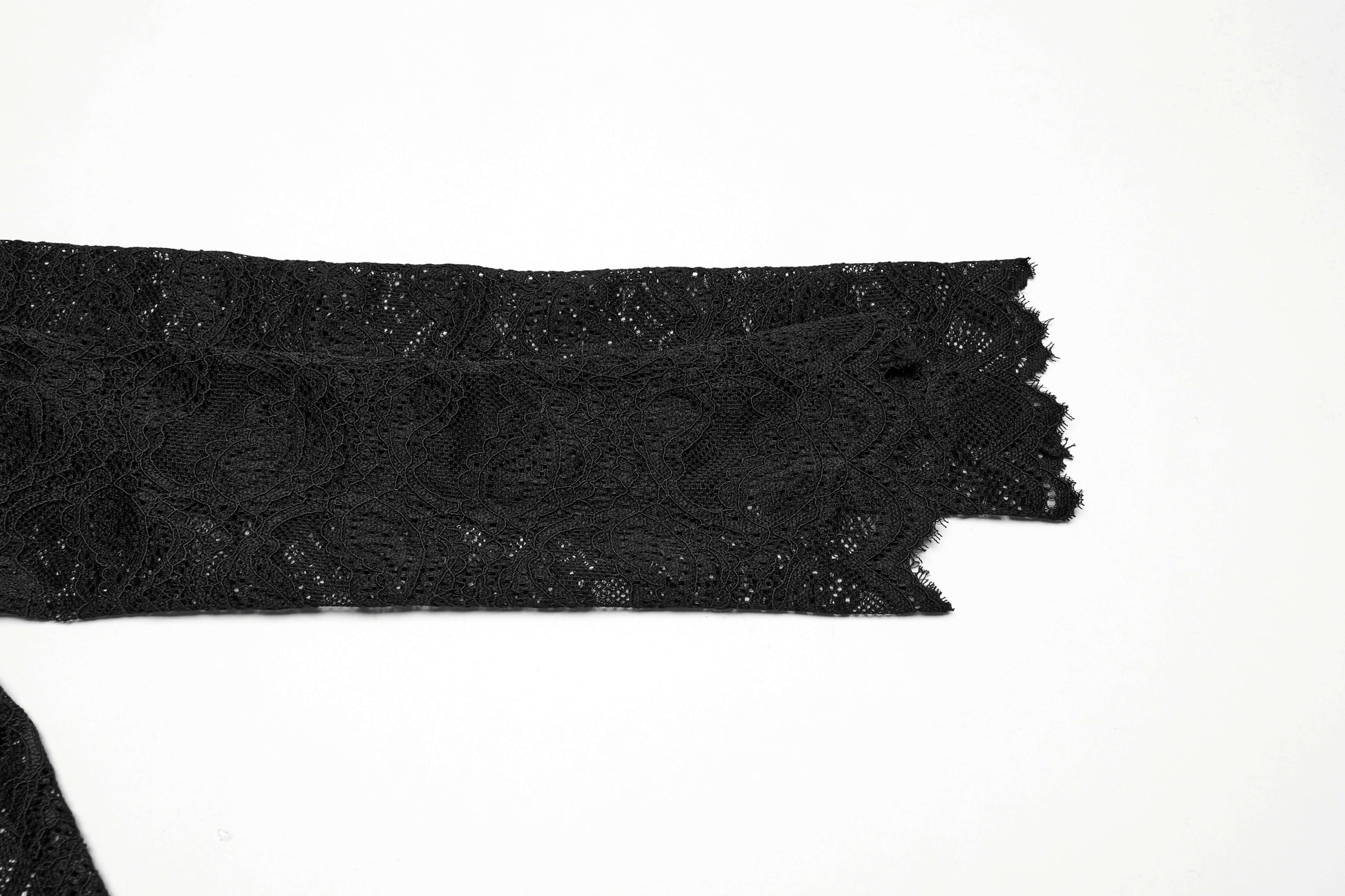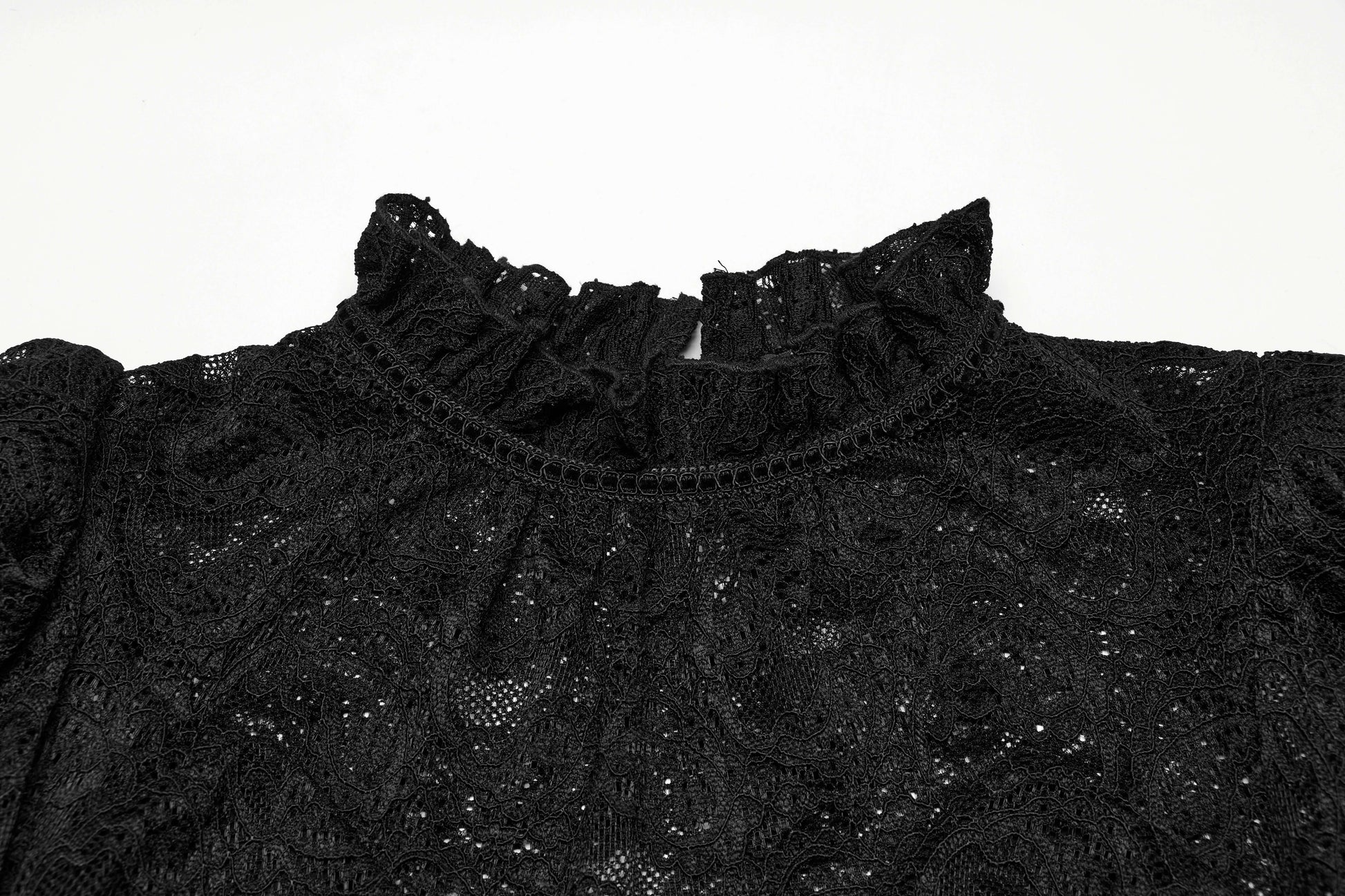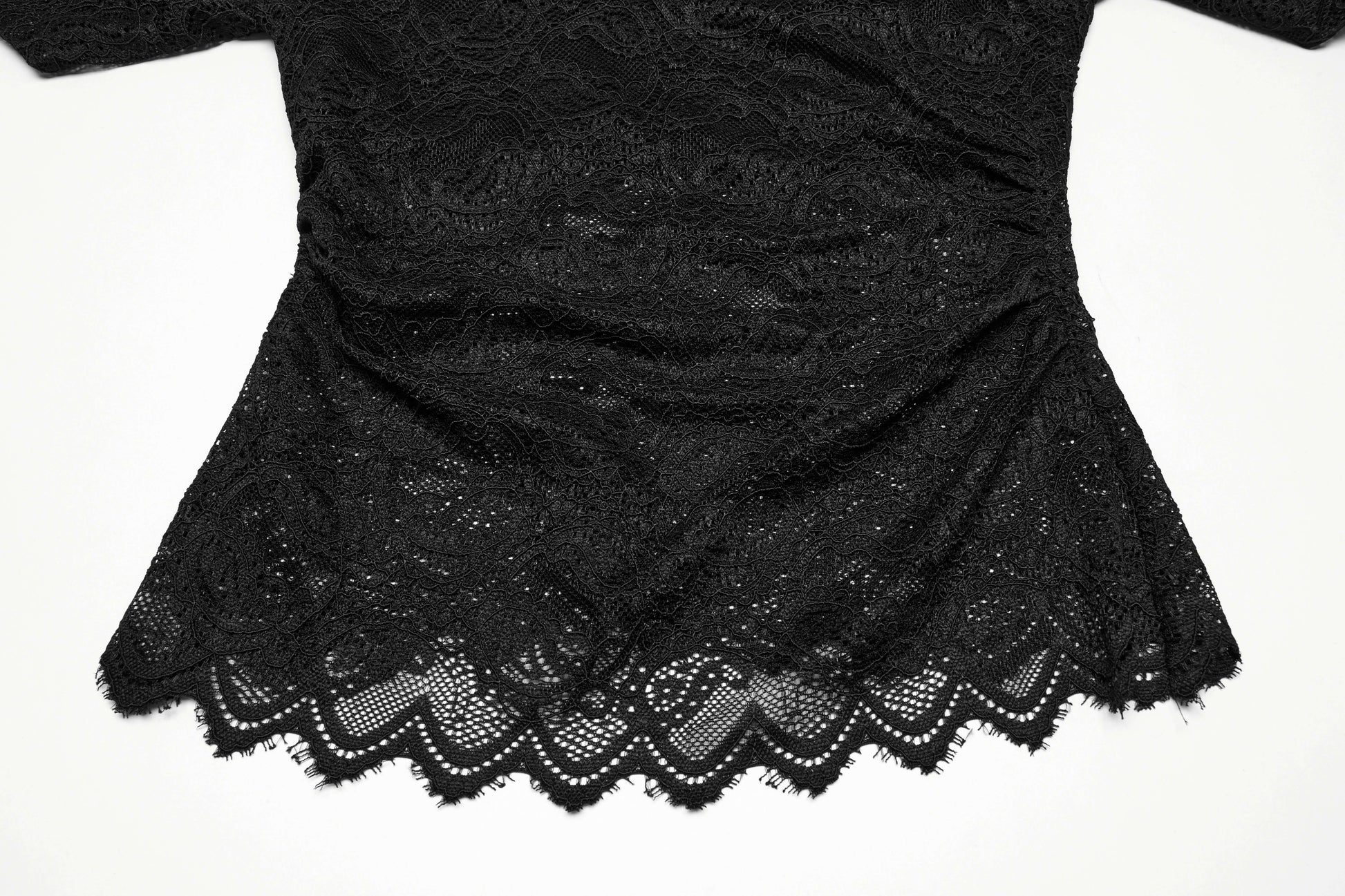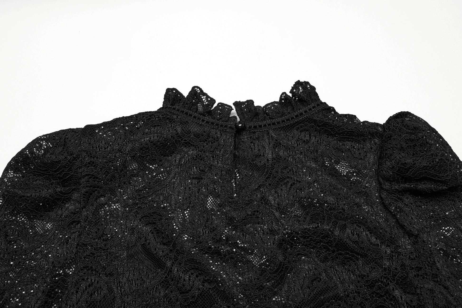 Rock the perfect balance of comfort and style with the Punk Rave Calantha Lace T-Shirt! Made with soft lace and modal fabric, this tee features an elegant ruffled stand collar and bubble sleeves. The pleated waist enhances your shape, while the wavy edges add a touch of edginess. Features a convenient neck split design for easy dressing. Who says you can't be comfortable and fierce?