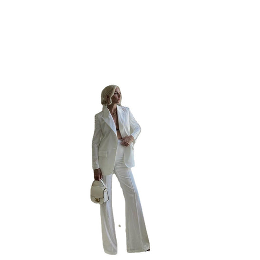 Vireous White Loose Long-Sleeve Sparkling Pearl-Beaded Jacket