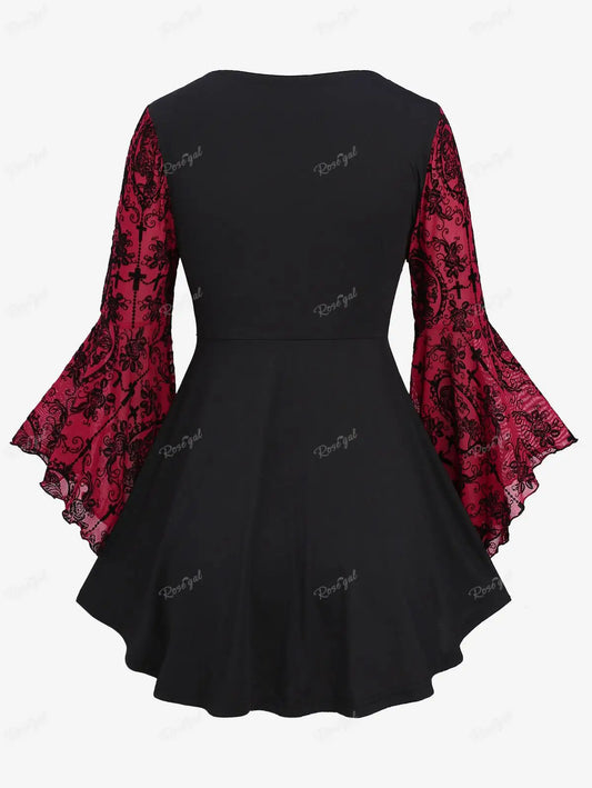 Gothic Bell Sleeves Organza Mesh Lace-Up Blouse, Plus Sizes