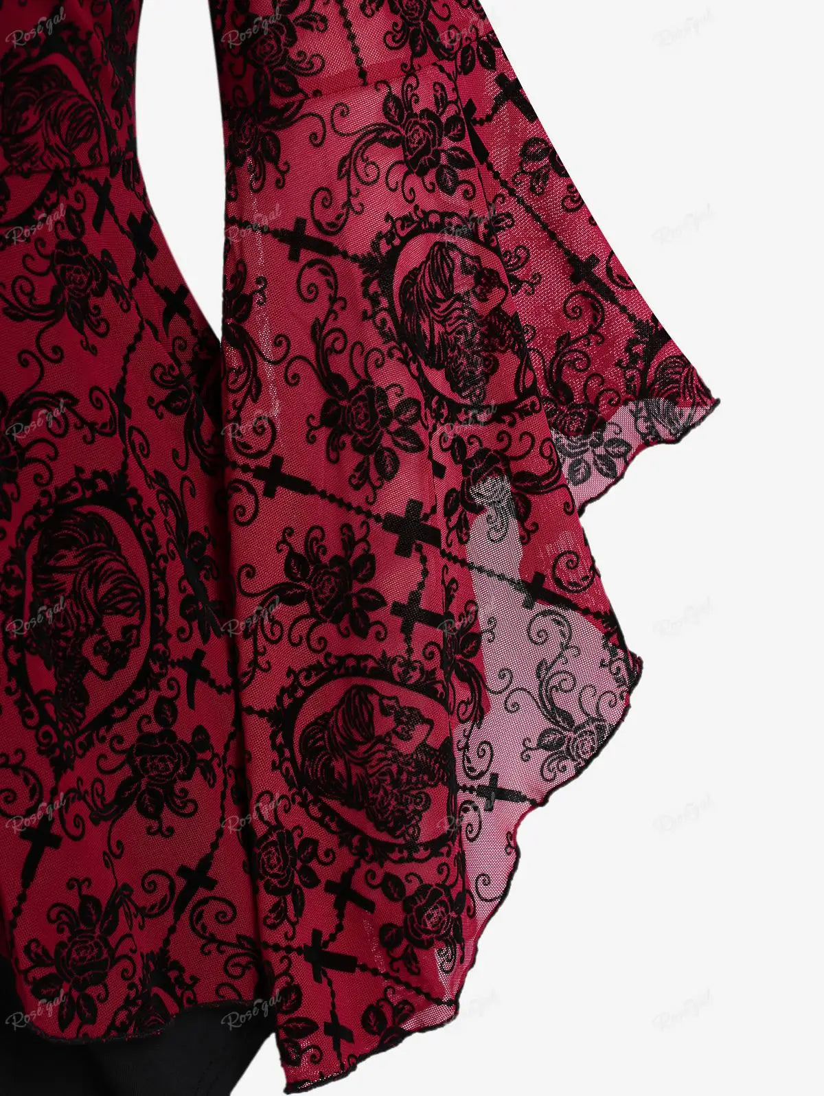 Gothic Bell Sleeves Organza Mesh Lace-Up Blouse, Plus Sizes