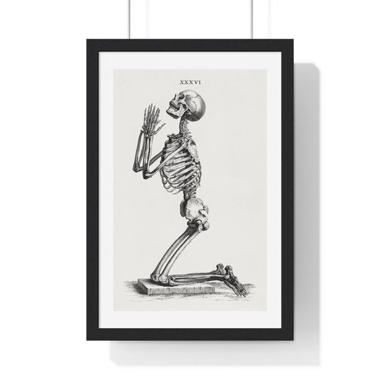 Human Skeleton Kneeling in Prayer (1733) Vintage Illustration by William Cheselden, from the Original, Framed Art Print