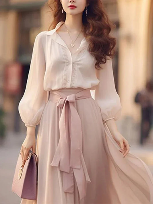 Elegant Retro French Women's Lace-Up Chiffon Two-Piece Outfit