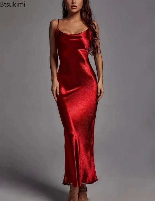 Vireous Summer Silk Satin Sleeveless Long Dress, Draped Bodice