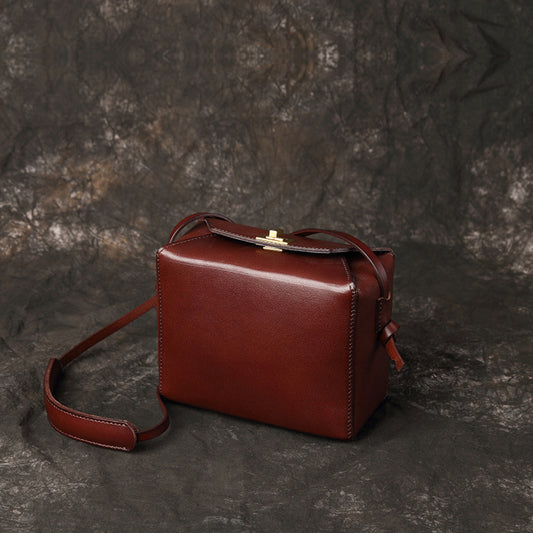 Square Box Bag, Retro Cowhide Leather Women's Handag Messenger Bag