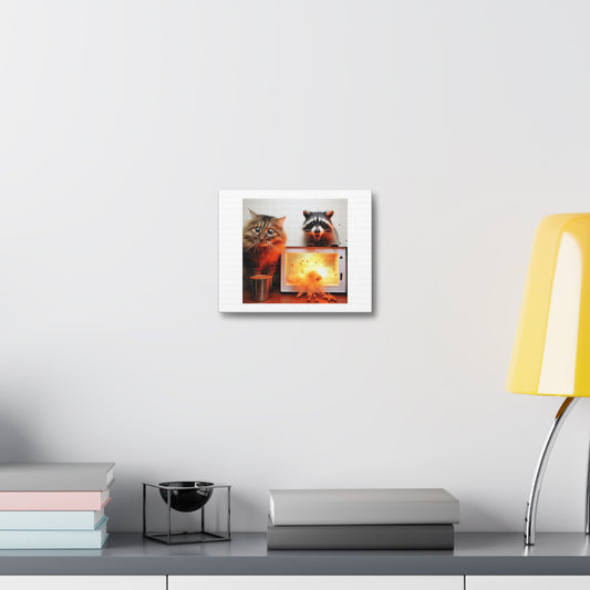 Cat and Raccoon Are Wide Eyed After Putting Exploding Beans in the Microwave 'Designed by AI' Art Print on Canvas