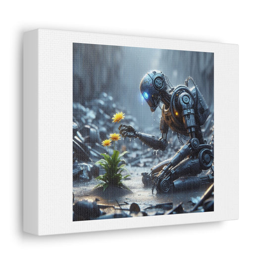 Cinematic Rendering of Robot Kneeling to Observe Yellow Flowers 'Designed by AI' Art Print on Canvas