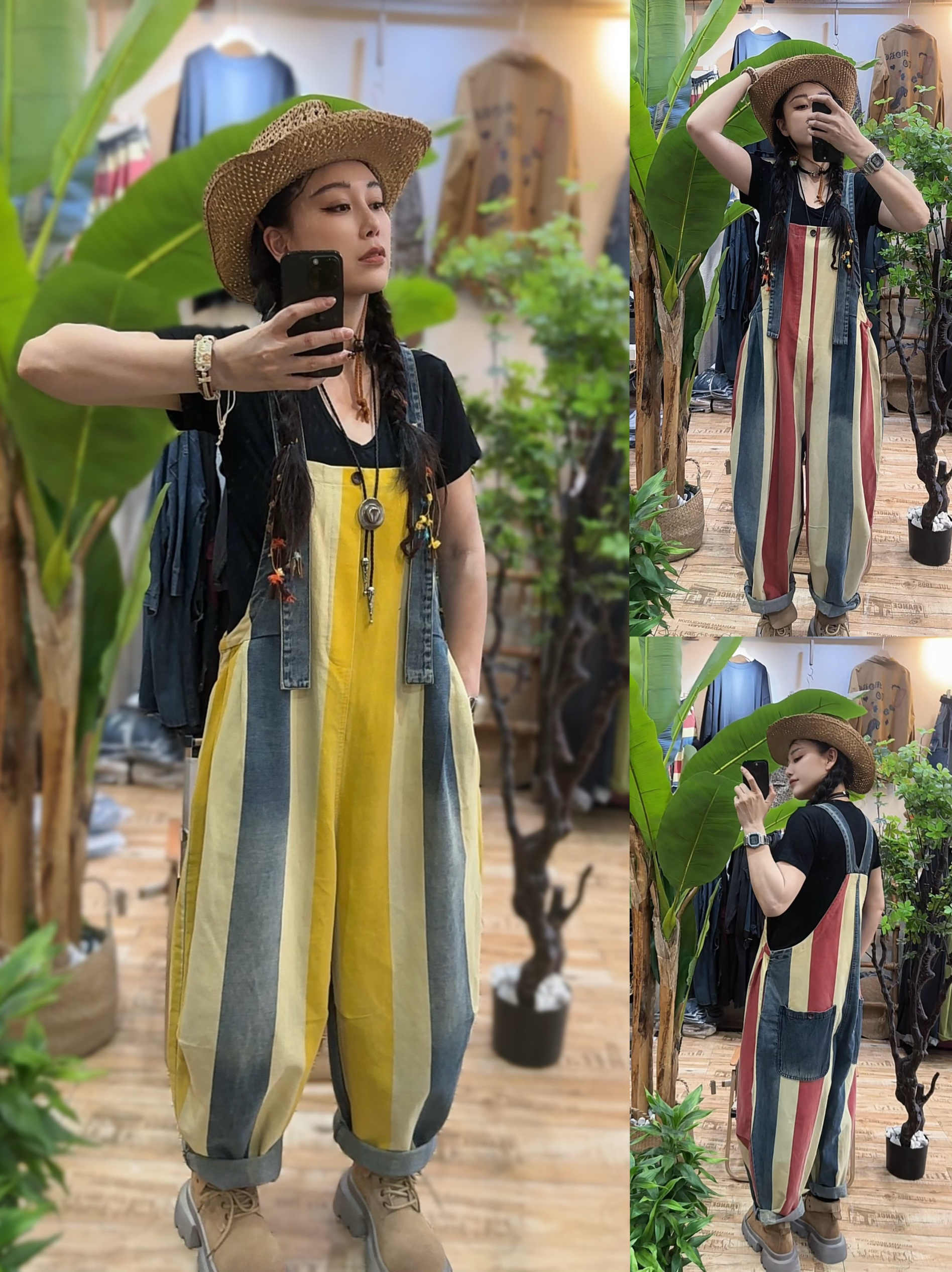 Vintage Stripe Suspender Pants, Women's Loose Cotton Denim Jumpsuit