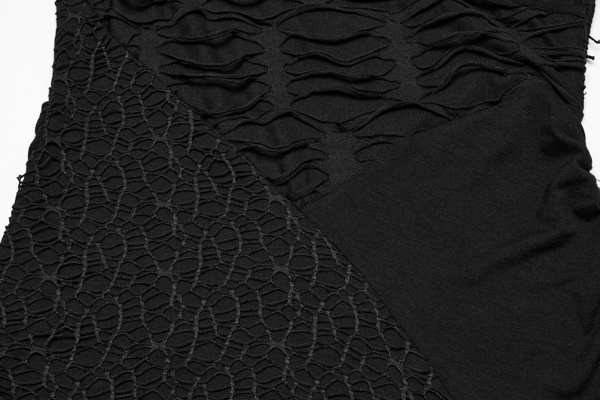 This elegant sleeveless dress from Punk Rave combines elastic knitted fabric with perforated mesh for ultimate comfort and a touch of edge. The sharp deep v-neck adds a sexy touch, while the different fabric splicing design and irregular hem highlight a punk and rebellious personality. Available in black.