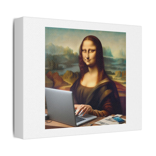Photorealistic Painting of Mona Lisa Working on a Laptop, Computer Art Print 'Designed by AI' on Satin Canvas