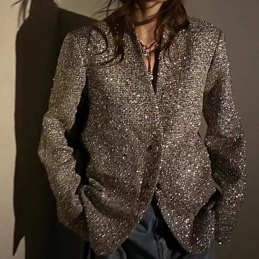 Vireous Elegant Classic-Style Silver-Thread Tweed Women's Blazer