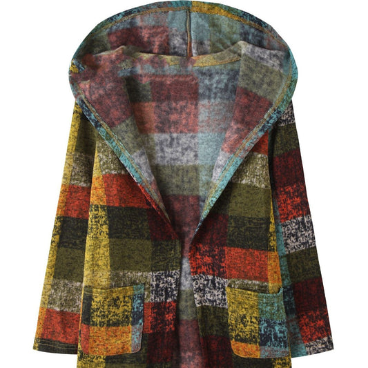 Women's Vintage Plaid Printed Hooded Fleece Short Coat