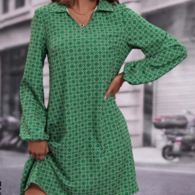 Vireous Long Sleeve Geometric Print Polo Collar Dress