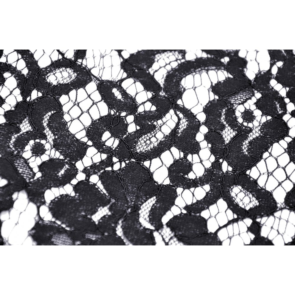 Stunning fishtail skirt from Dark in Love featuring a velvet jacquard fabric with a delicate lace hemline and corset inspire ribbon lacing to the back. Fastening with a concealed zip to the side, this gorgeous midi skirt has a striking lace applique to the front.